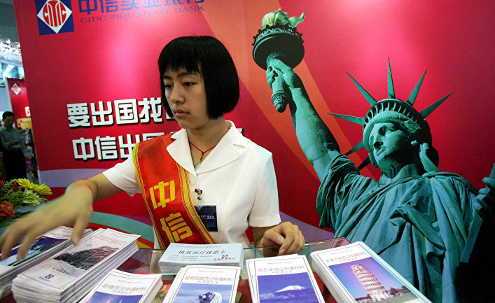 Девушка у стенда китайской компании CITIC на Международной выставке финансовой культуры в Пекине, КНР