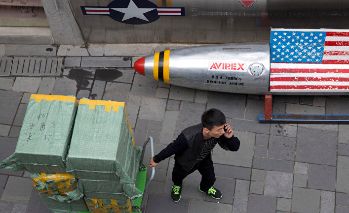 Мужчина с тележкой возле скамейки в виде ракеты с флагом США рядом с магазином в Пекине