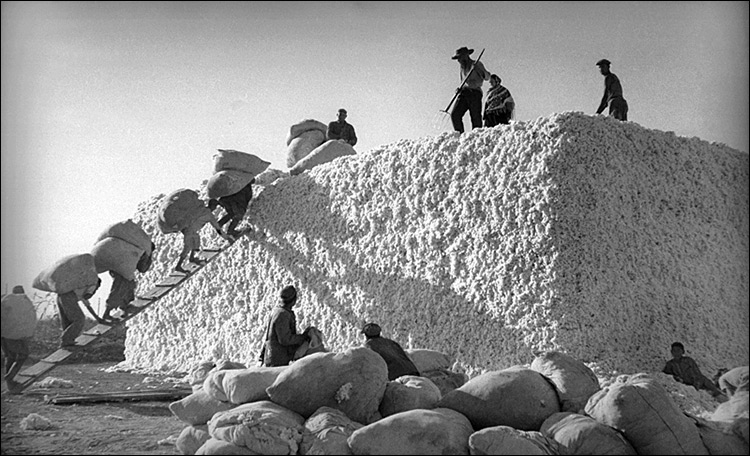 Как известно, активно выращивать хлопок в регионе начали в XIX веке. При Сталине запросы государства сильно выросли: сеть каналов расширилась, и под хлопок выделили почти миллион гектаров орошаемых земель. Обрабатывались поля вручную. Хотя в Центральную Азию отправили 484 трактора, регион все равно стоял на последнем месте по темпам механизации, уступая зерновым районам России и Украины. Вторая мировая война еще сильнее ударила по механизации сельского хозяйства: тысячи тракторов оказались на оккупированных территориях, а заводы, где их делали, перешли на производство танков.