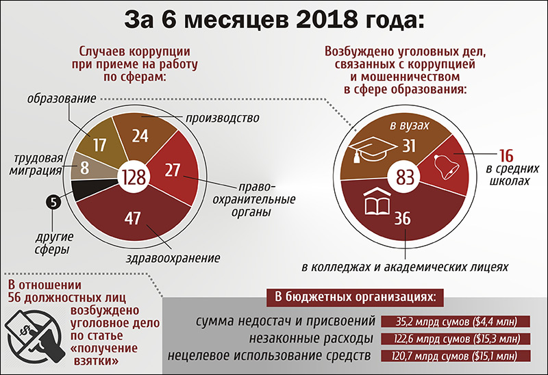 Задержание хокимов и высокопоставленных госслужащих на местах – далеко не единичные случаи коррупционных дел последних месяцев. Так, в начале сентября были заключены под стражу руководители пяти крупных рынков в Ташкенте за хищение около 4 млн. долларов и нанесение ущерба государству. Им грозит от пяти до десяти лет лишения свободы.