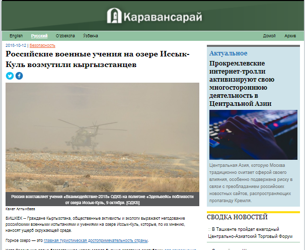 “Российские военные учения на озере Иссык-Куль возмутили кыргызстанцев” – под таким заголовком в середине октября о прошедших учениях рассказал сайт “Каравансарай”. Публикация эта не заслуживала бы внимания, если бы не одно любопытное обстоятельство.