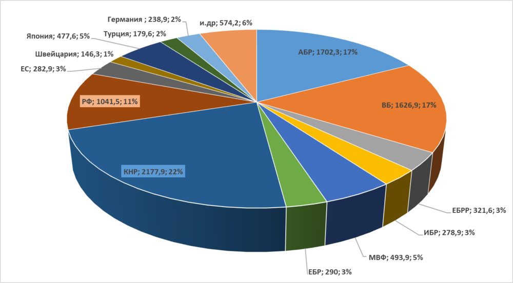 Д.Турдумалиева добавила, что основных доноров Кыргызстана согласно статистке можно разделить на два типа — международные организации и иностранные государства. К первым относятся Азиатский банк развития (АБР), Всемирный банк ВБ), Евразийский банк реконструкции и развития (ЕБРР), Евросоюз (ЕС), Исламский банк развития (ИБР), Международный валютный фонд (МВФ) и др. Они предоставили стране 48% всех средств.