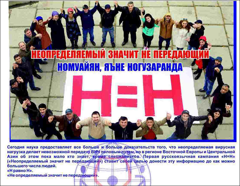 Плакат «Неопределяемый значит непередающий» (Н=Н) гласит, что неопределяемая вирусная нагрузка делает невозможной передачу ВИЧ половым путем. Иллюстрация предоставлена НПО «СПИН Плюс»