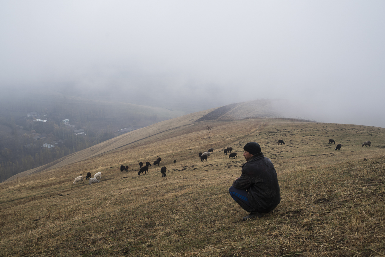 Во время визита Eurasianet.org подросток Отабек, старший сын Азата, бегал по склонам, ловко сгоняя овец.