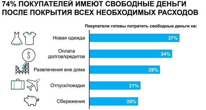 68% покупателей до сих пор живут в режиме экономии и намерены продолжать экономить, даже если ситуация улучшится. Судя по статистике Nielsen, свободные деньги (после необходимых расходов: покупки продуктов питания и оплаты коммунальных услуг) казахстанцы готовы потратить на новую одежду и оплату кредитов и долгов.
