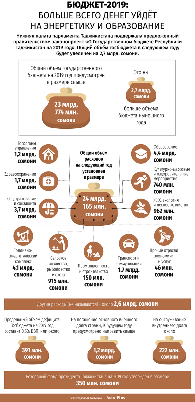 Источник информации: https://news.tj/ru/news/tajikistan/economic/20181206/na-chto-tadzhikistan-rastratit-byudzhet-2019-goda