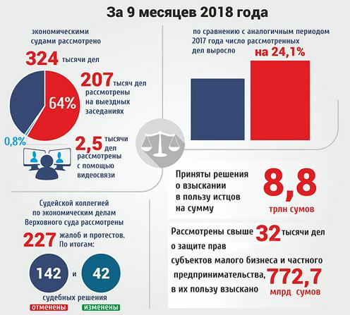Стоит отметить, что количество дел, рассматриваемых в экономических судах, растет. Их число увеличилось на 24,1% по сравнению с аналогичным периодом 2017 года. Можно, конечно, отнести это на счет увеличения числа жуликов, а можно отыскать в этом и положительные черты. Некоторые объясняют рост активностью самих экономических судов, а во-вторых, тем, что хозяйствующие субъекты стали чаще обращаться к судам. И происходит это потому, что у людей выросло доверие к законным способам разрешения экономических споров.