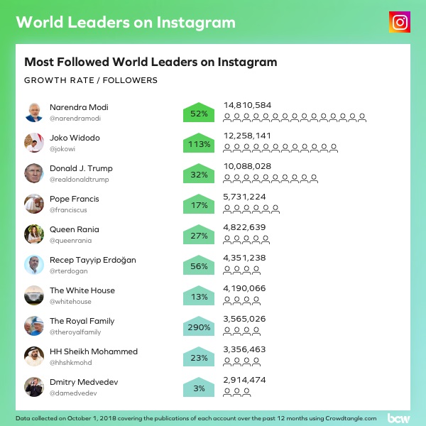 В рамках исследования были проанализированы 426 государственных аккаунтов в социальной сети Instagram. В мировом рейтинге на первом месте расположился Instagram-аккаунт премьер-министра Индии Нарендры Моди с 15 миллионами подписчиков, далее следует аккаунт президента Индонезии Джоко Видодо с более 12 миллионами подписчиков и президента США Дональда Трампа с более 10 миллионов подписчиков.