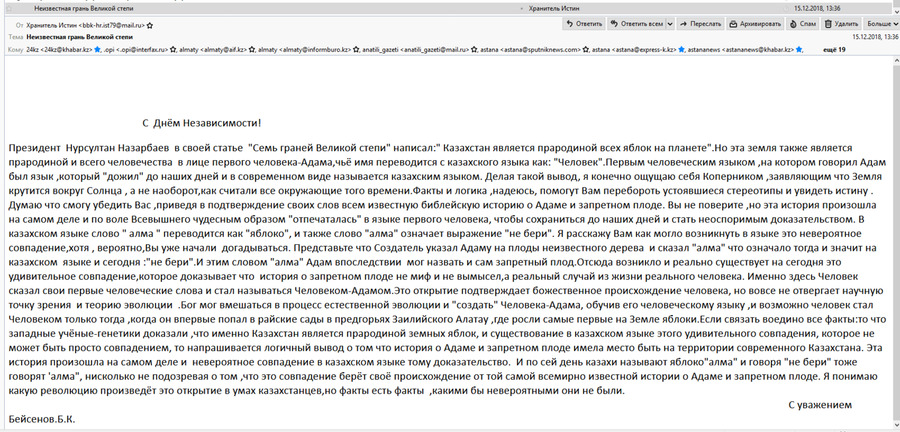 Свое письмо автор начинает с отсылки к статье президента Казахстана Нурсултана Назарбаева "Семь граней Великой степи". Приведем письмо полностью.