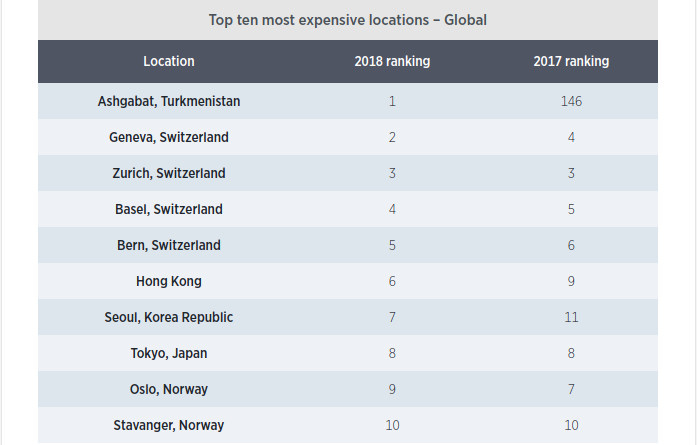 Десятка мировых городов в рейтинге выглядит следующим образом: Ашхабад, Женева, Цурих, Базель, Берн (Швейцария), Гонконг, Сеул, Токио, Осло, Ставангер (Норвегия).