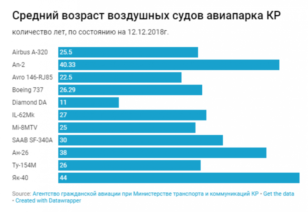 По данным Агентства гражданской авиации при Министерстве транспорта и дорог, в авиапарке Кыргызстана числятся 32 воздушных судна, 8 из которых — вертолеты. Из оставшихся 24-х пассажирских самолетов летной годности подлежат только 10.