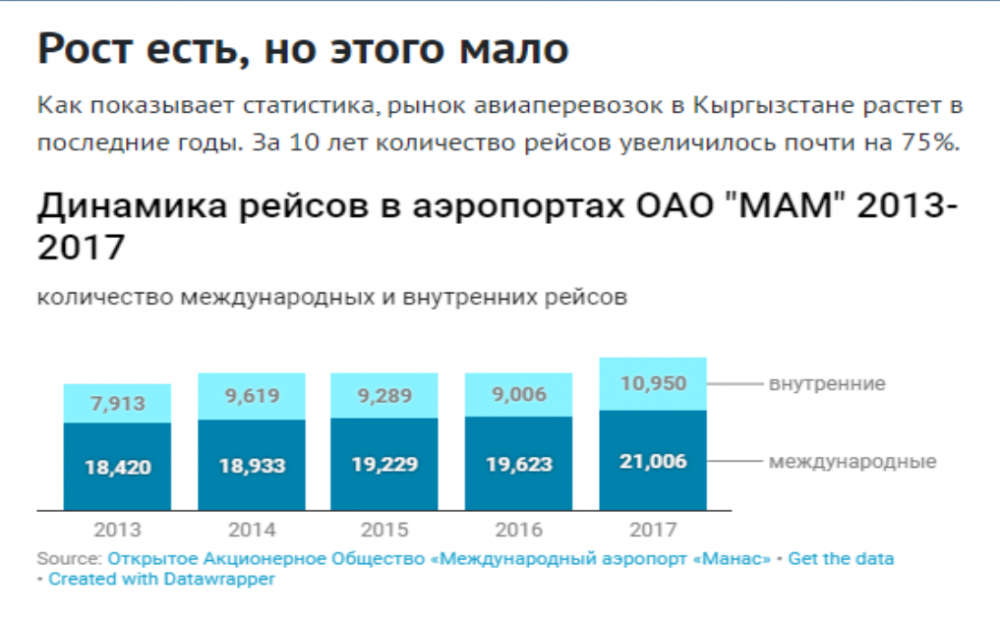 Как показывает статистика, рынок авиаперевозок в Кыргызстане растет в последние годы. За 10 лет количество рейсов увеличилось почти на 75%.