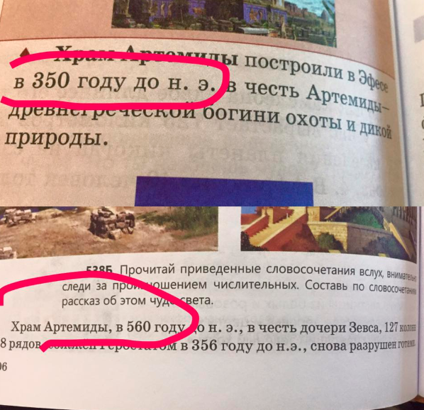 Разные даты строительства храма Артемиды на разных страницах учебника истории для 6 класса. Фото: Time.kz