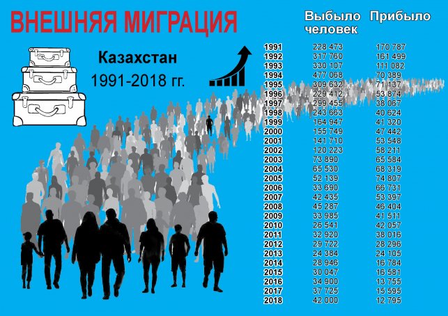 А пока есть смысл привести данные официальной статистики, которые в абсолютных показателях наглядно иллюстрируют динамику внешней миграции Казахстана за период с 1991-го по 2018-й.