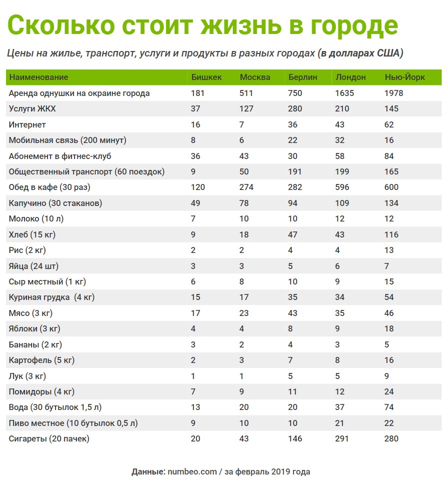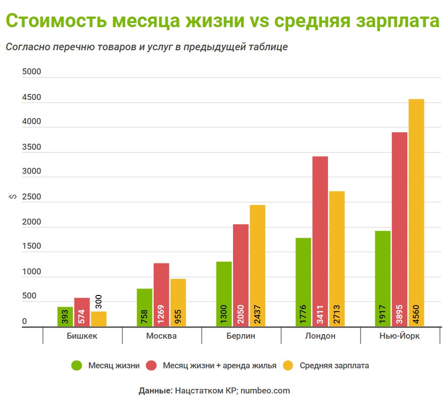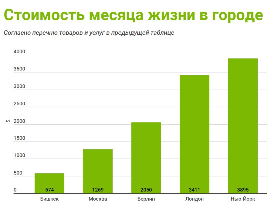 Калькуляция всех вышеперечисленных услуг и продуктов дает следующие результаты. На месяц жизни в Бишкеке нужно $574, в Москве - $1 269, в Берлине - $2 050, в Лондоне - $3 411, в Нью-Йорке - $3 895.