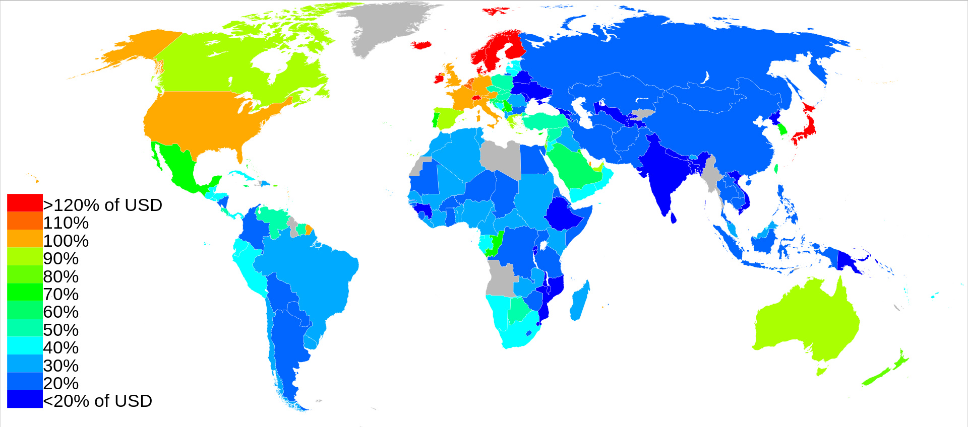 Отследить уровень цен можно, например, по этой карте. Здесь уровень цен в экономике США принят за базовый (карта 2003 года).