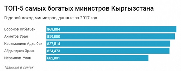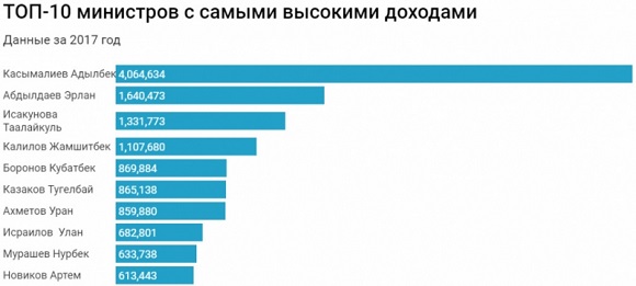 Дороже остальных труд оплачивался у Кубатбека Боронова, занимавшего должность министра чрезвычайных ситуаций. Его средняя зарплата в 2017 году составила почти 72,5 тыс. сомов. Сегодня Боронов занимает пост первого вице-премьер-министра и курирует проект «Цифровой Кыргызстан».