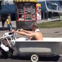 "Дорогими машинами алматинцев уже не удивить, а ванна на колёсах и с мотором оказалась отличным head turner. Смотрим, как парень с полотенцем на плечах и намыленной головой катит в ванне по проспекту Абая" - такое сообщение разместил на Youtube пользователь Kolesa.kz.