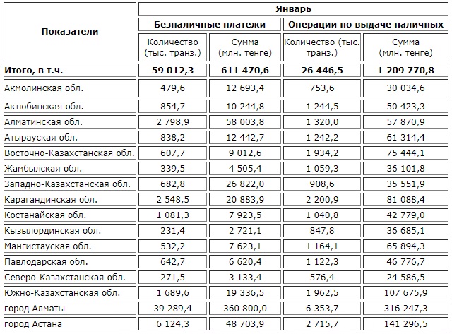 «Объем безналичных платежей снизился в январе почти во всех регионах за исключением Алматинской, Западно- и Южно-Казахстанской областей (ныне – Туркестанская область).