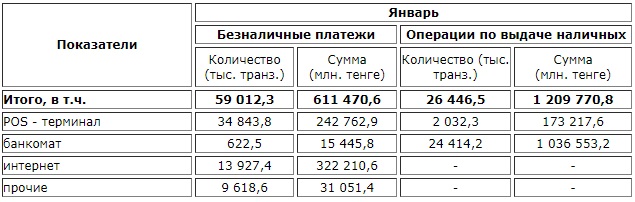 «В январе 2019 года общий объем транзакций с использованием платежных карточек казахстанских эмитентов (безналичные платежи на территории и за пределами РК, а также операции по снятию наличности) составил 1 946,9 млрд тенге (рост по сравнению с январем 2018 года 55,3%).