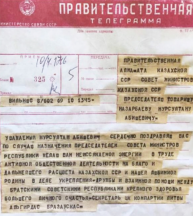 Поздравительная телеграмма по случаю назначения Нурсултана Назарбаева Председателем Совета Министров Казахской ССР