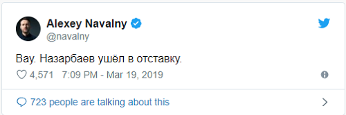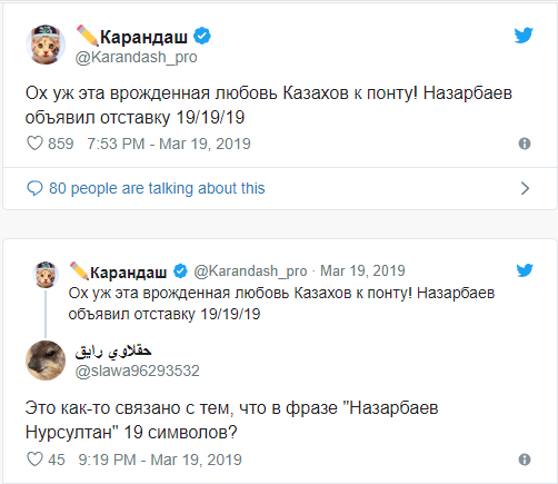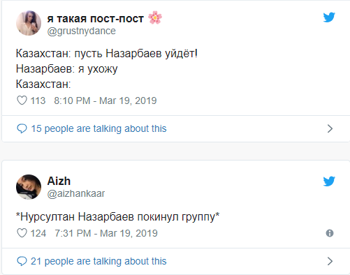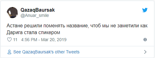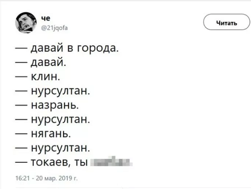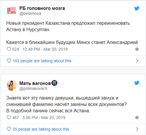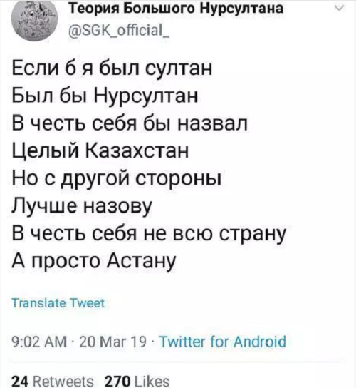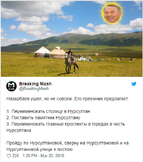 Однако отставка Назарбаева обернулась настоящей “смехопанорамой” в соцсетях, когда через день после отставки верные депутаты с подачи второго президента Касым-Жомарта Токаева предложили переименовать столицу страны Астану в “Нурсултан”. Мгновенно имя “Нурсултан” стало объектом многочисленных шуток, а в российском Телеграме даже провели флешмоб и нарекли себя “Нурсултаном” сразу  несколько крупных каналов.