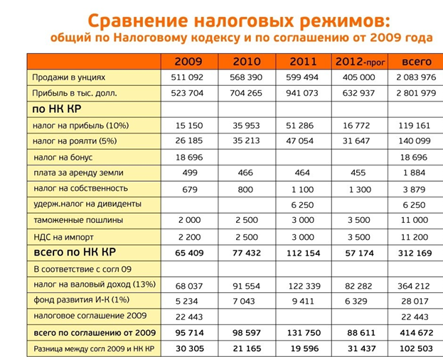 Согласно расчетам, сделанным Государственной комиссией по Кумтору в 2013 году, если бы «Центерра» работала по общему налоговому режиму, как другие золотодобывающие компании, то она платила бы меньше налогов и других отчислений в бюджет. Таким образом, Кумтор не работает в более благоприятных условиях, чем те, что Кыргызстан предоставляет золотодобывающим компаниям.