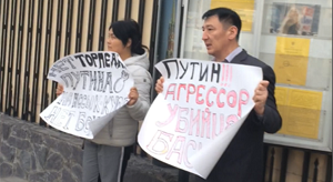 За день до приезда в Кыргызстан президента России Владимира Путина стало известно, что на пикет к Посольству РФ в КР вышла семейная пара - Нурлан Карымшаков и Гульзана Имаева. Супругов, которые держали плакаты с надписями «Путин – агрессор, убийца» и «Нет торпедам Путина на Иссык-Куле», утром 27 марта задержала милиция. По словам их адвоката Замира Жоошева, арестованных незаконно продержали весь день в отделении милиции и только потом передали следователю.
