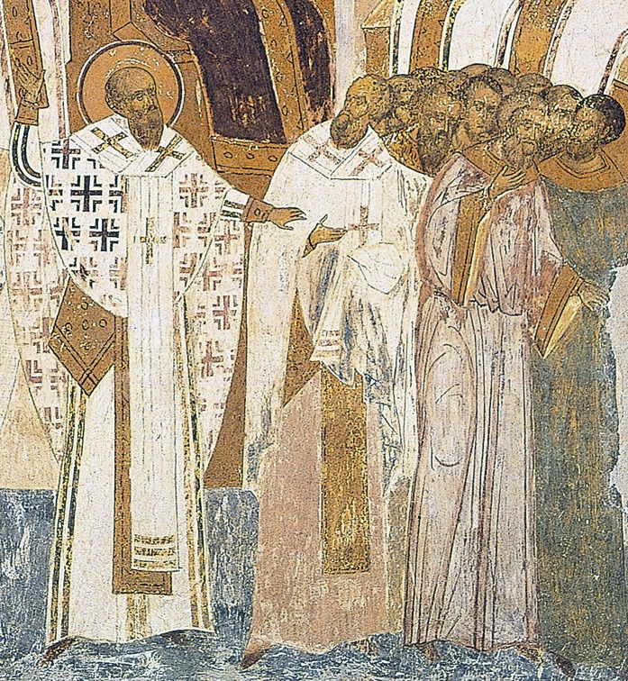 Священник в длинной рясе держит в левой руке книгу, а в правой крест и стоит перед верующим, изображенным коленопреклоненным и без головного убора. Поэтому прежде всего оно было принято купцами в городах, знатью, занимавшейся международной торговлей, и местными правителями.