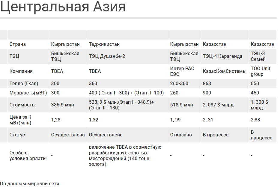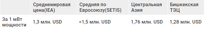 То есть, если брать среднюю цену по Центральной Азии ($1,76 млн за 1 МВт), модернизация ТЭЦ могла обойтись Кыргызстану в $528 млн. И если сравнить с нашими затратами ($386 млн или $1,287 млн за 1 МВт) то получается, напротив, Кыргызстан сэкономил на модернизации ТЭЦ $141,9 млн.