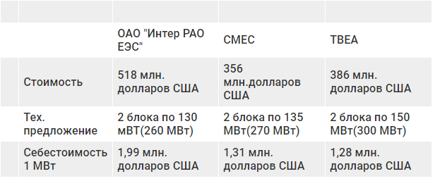 - Следует также отметить, что был также предложен проект за $518 млн (ИНТЕР РАО ЕЭС) – разработанный российским институтом концептуальный проект расширения ТЭЦ на восточную часть мощностью 260 МВт и увеличением подачи тепловой энергии на 260 Гкал. Единственный вариант сопоставимый с осуществленным проектом по техническим параметрам и объемам строительства, но без учета стоимости сероочистки, которая выполнена в осуществленном проекте. При этом, сметы на $518 млн составлены по действовавшим на тот момент российским нормативам.