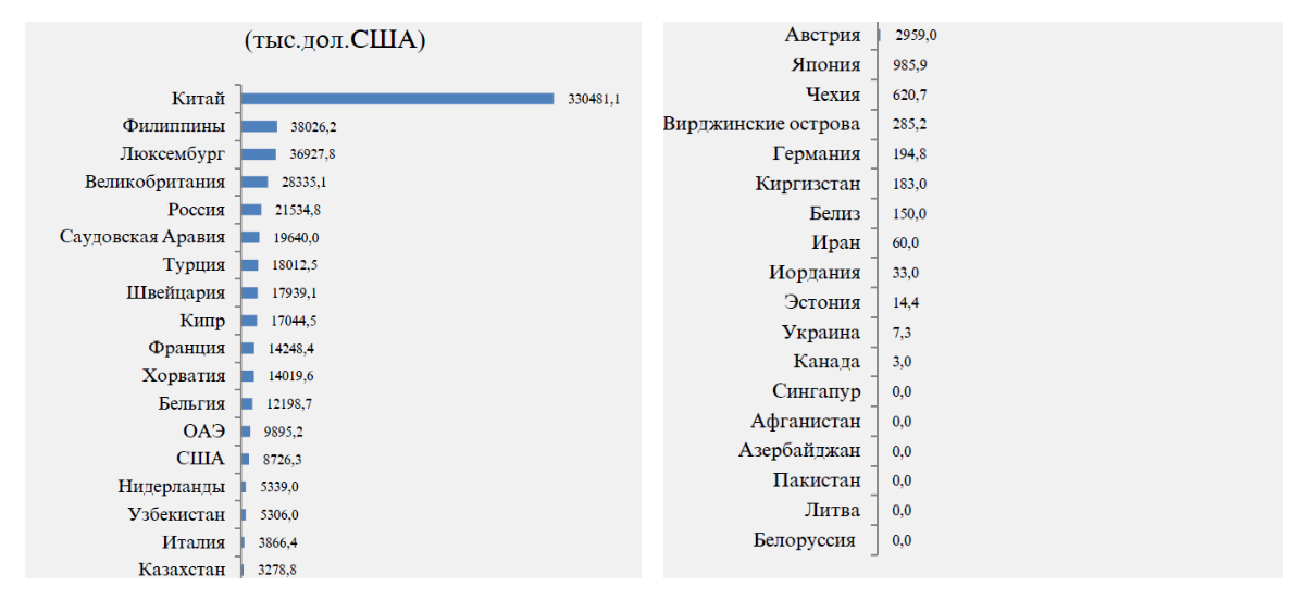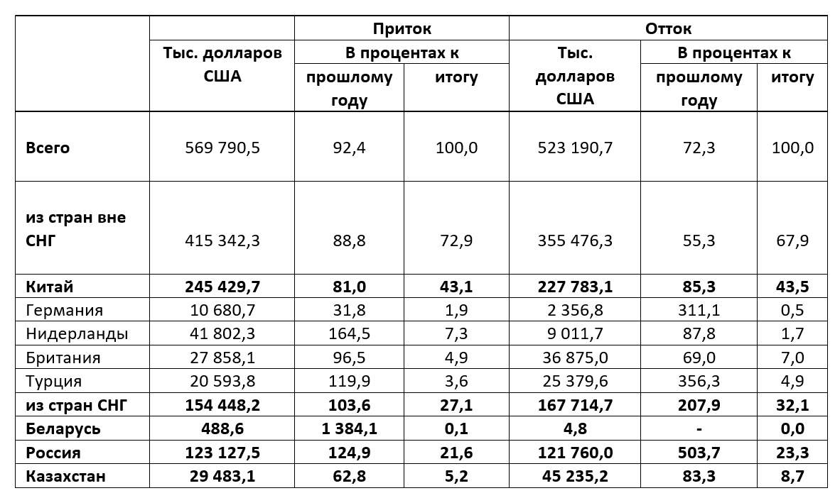 В общем объёме поступивших прямых иностранных инвестиций, несмотря на указанное выше сокращение, наибольший удельный вес пришёлся именно на Китай (43,1 % от общего объёма поступивших инвестиций), затем следуют Нидерланды (7,3 %), Великобритания (4,9 %), Турция (3,6 %) и Швейцария (3,4 %).
