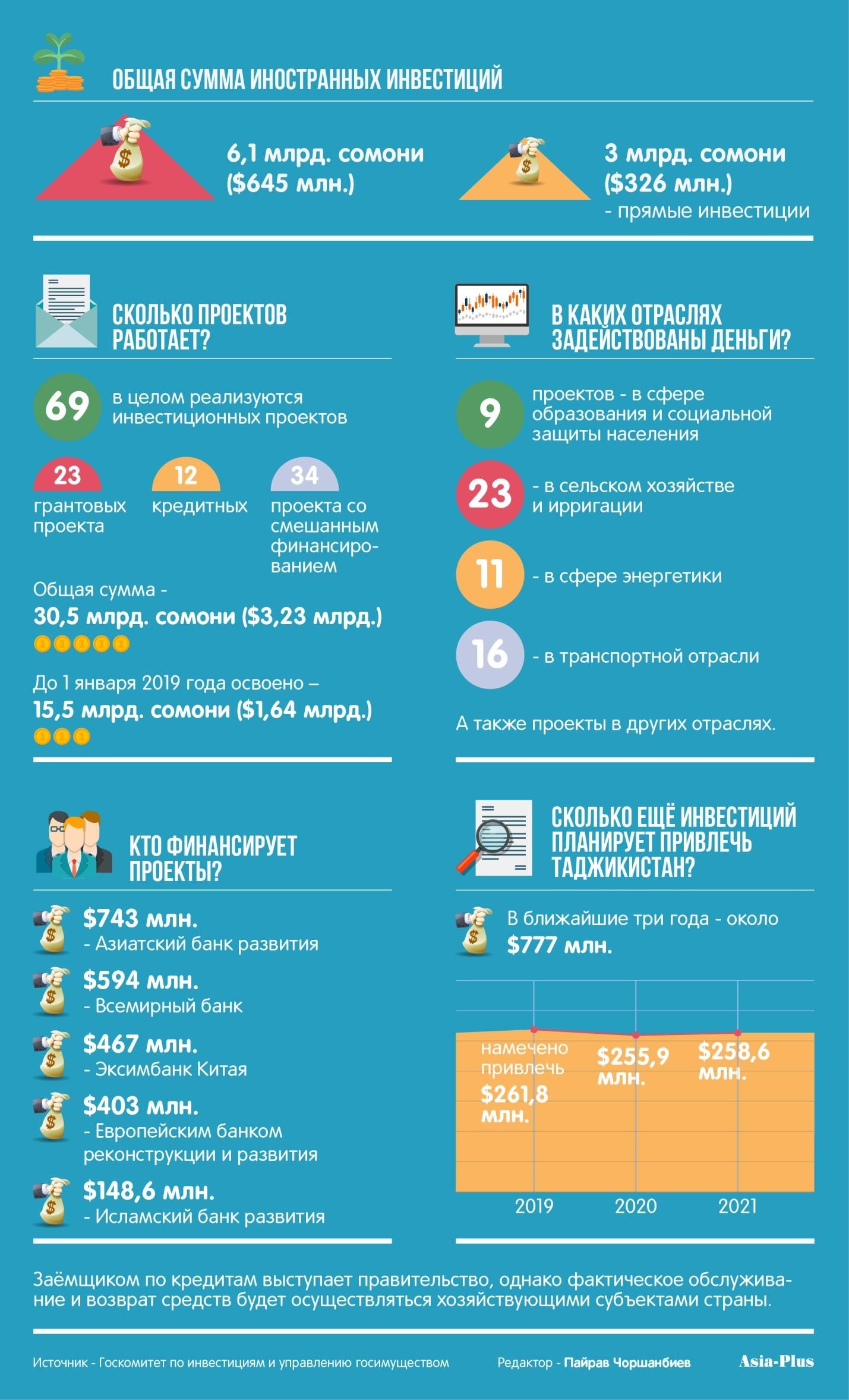 В период же с 2007 по 2018 год Китай инвестировал в Таджикистан 2,5805 млрд долларов США. Россия — 1,5956 млрд, Казахстан — 568 млн долларов, Британия — 678,8 млн, Филиппины — 455,6 млн долларов.