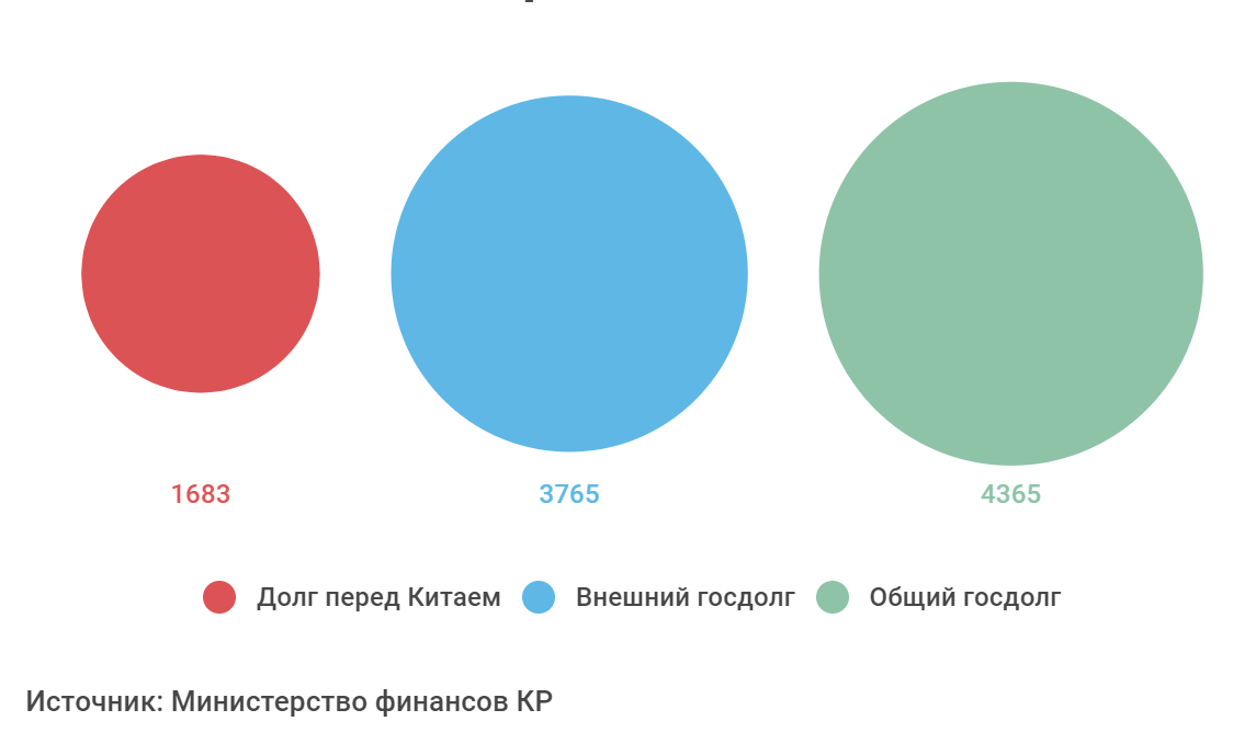 На конец сентября 2018 года внешний государственный долг Киргизии составил почти 3,8 млрд долларов, их них 1,7 млрд — перед Поднебесной. Причём задолженность перед Китаем выросла практически в 200 раз за последнее десятилетие.
