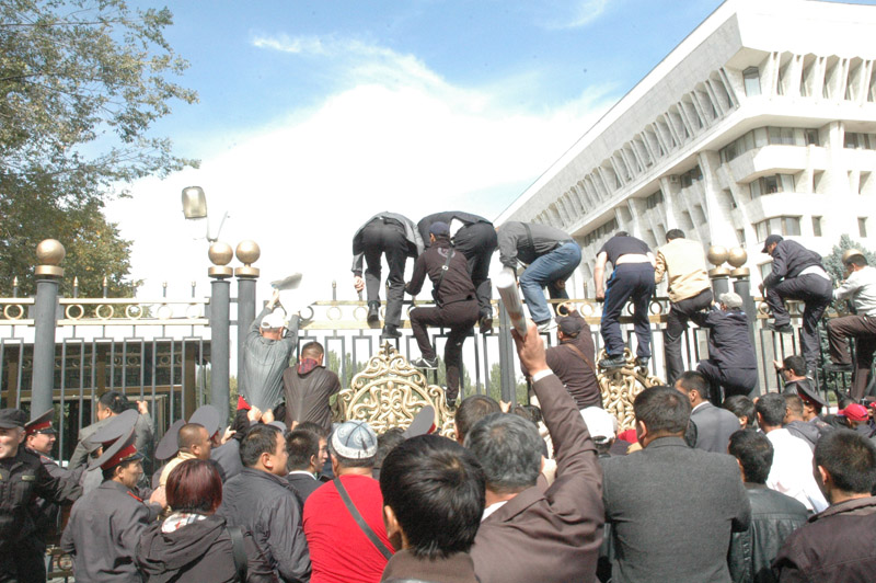 Оппозиционеры лезут через ограду Дома правительства Кыргызстана. Фото - Mail.ru