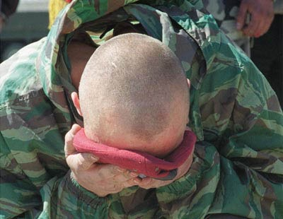 17. Завершающий этап конкурса за право носить краповый берет – рукопашный бой. Три раунда по три минуты. В первых двух раундах кандидаты бьются один на один между собой, в третьем – с обладателем крапового берета. Если «краповик» проиграет кандидату в рукопашной схватке, то с него снимут берет, поэтому с обессиленными кандидатами, несмотря на их усталость, никто не церемонится – бьют по-настоящему. Для кандидата главное – выдержать эти три раунда. (На фото – кандидаты в боксерских шлемах).