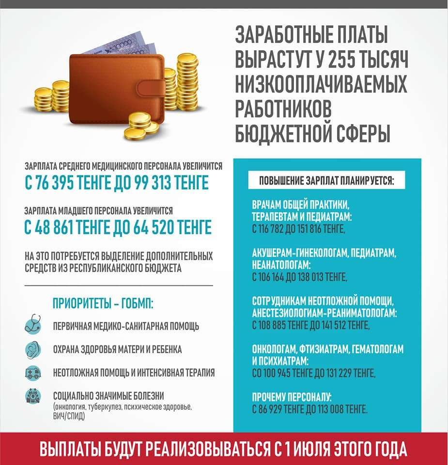 Повышение зарплат низкооплачиваемому медперсоналу на 30% – это на сколько? В начале марта Елбасы поручил поднять заплату медикам с 1 июля. 9 апреля президент Касым-Жомарт Токаев встретился с министром здравоохранения Елжаном Биртановым, чтобы обсудить повышение жалованья низкооплачиваемому медперсоналу на 30% уже с 1 июня: