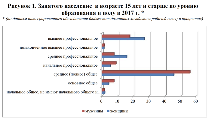В 2017 году в общей численности занятых доля женщин, имеющих высшее профессиональное образование, составила 27%, мужчин – 17%, среднее профессиональное, соответственно, около 16% и 7%.