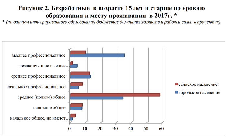 В сельском населении, наоборот, высока доля безработных, имеющих среднее общее образование – 58,2%. Эти данные еще раз подтверждают более низкий образовательный уровень, как среди занятого населения, так и среди безработных граждан (Рисунок 2).