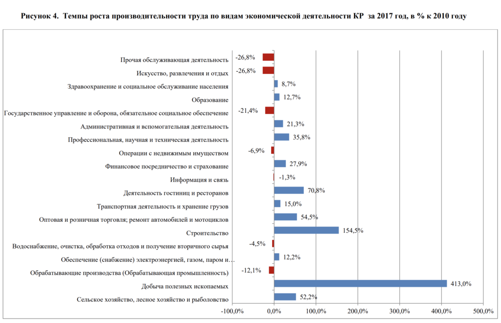 Несмотря на то, что по ряду большинства отраслей в КР, можно отметить положительный рост производительности труда (рис. 4), возникла необходимость обратить внимание на отрасли, в которых прослеживается отрицательный рост и требуется материальная и ценностная капитализация таких отраслей как: