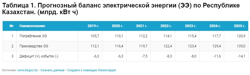 Казахстан является одной из самых богатых стран по наличию полезных ископаемых. Однако энергетический потенциал страны используется не на максимальном уровне. На текущий момент сферу электроэнергетики в основном обеспечивают угольная, газовая и нефтегазовая промышленности. По прогнозному балансу электрической энергии на 2019-2025 годы министерства энергетики РК в Казахстане не ожидается какого-либо дефицита. Однако, по стране сформировалось неравномерное потребление и производство электроэнергии, в результате чего министерство энергетики прогнозирует постоянный дефицит в южных регионах страны (см. таблицы 1 и 2).