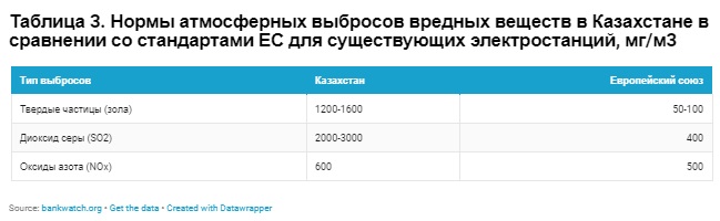 Возвращаясь в масштабы Республики Казахстан важно отметить, что помимо вреда от угля среднестатистического качества, добываемый уголь в стране имеет низкое выделение тепла, высокую долю влаги, наличие большого объема золы и серы. Оперируя нормами атмосферных выбросов вредных веществ можно провести сравнение ситуации в Казахстане с Европейским союзом. Так, превалирование выбросов вредных веществ очевидно и постепенное снижение доли угольной промышленности можно назвать необходимой потребностью связанной с интересами не только Казахстана, но и мира в целом.
