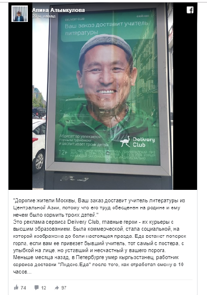 Внимание пользователей кыргызстанского сегмента соцсетей привлек один из курьеров компании. Это выходец из Средней Азии, учитель литературы по имени Абдисаттар. Его история напомнила о проблеме трудовой миграции в Кыргызстане, где из-за безработицы даже люди с высшим образованием вынуждены уезжать на заработки в Россию и работать в тяжелых условиях.