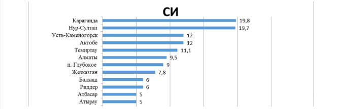 «Казгидромет» оценивает уровень загрязнения атмосферного воздуха по двум показателям. Один из них – стандартный индекс (СИ). Он показывает «наибольшую измеренную в городе максимальную разовую концентрацию любого загрязняющего вещества, деленную на ПДК».
