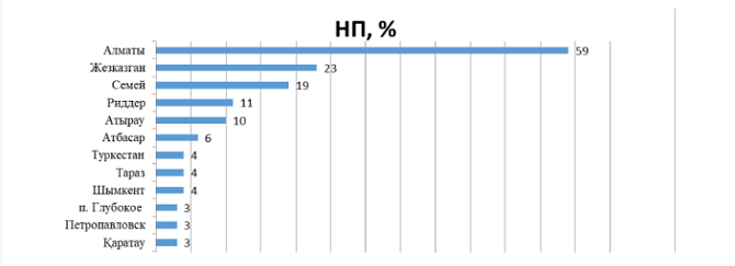 Второй показатель – это наибольшая повторяемость (НП). Он измеряется в процентах и показывает «наибольшую повторяемость превышения ПДК любым загрязняющим веществом в воздухе города». Тут абсолютным лидером по загрязнению является Алматы.