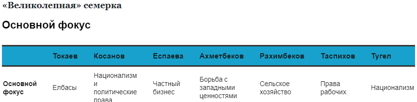 Итак, построение следующее: коммунист Ахметбеков слева, кандидат от партии предпринимателей Еспаева – справа, действующий президент – кандидат от правящей партии Токаев выступает в качестве центриста. Кандидат от «Ауыла» Рахимбеков апеллирует к селу, профсоюзный кандидат Таспихов обращается к рабочему классу. Есть два национал-патриотических кандидата: умеренный либеральный оппозиционер Косанов и вполне себе радикальный сторонник степной демократии Тугел.