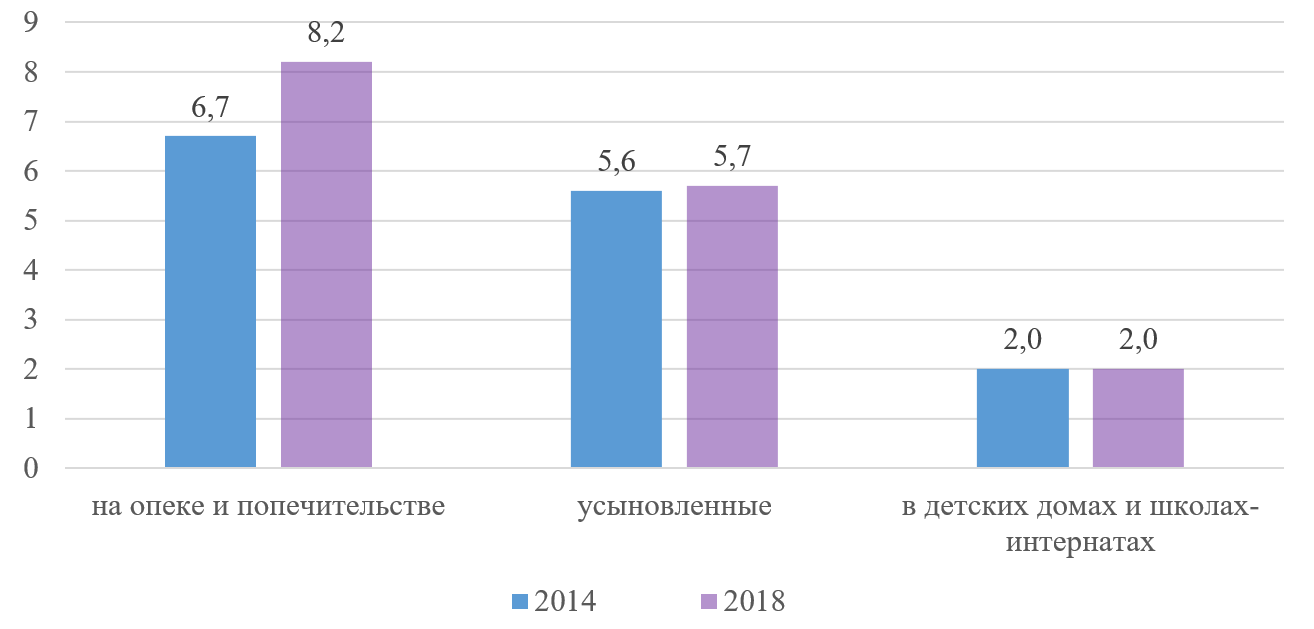 На конец 2018 года на воспитании в семьях находились 13,8 тыс. детей, из них 5,3 тыс. - круглые сироты, в том числе 8,2 тыс. - на опеке и попечительстве и 5,7 тыс. детей – усыновленных/удочеренных. В течение 2018 года было выявлено 2 тыс. детей и подростков в возрасте до 18 лет, оставшихся без попечения родителей, из них 771 - круглые сироты.