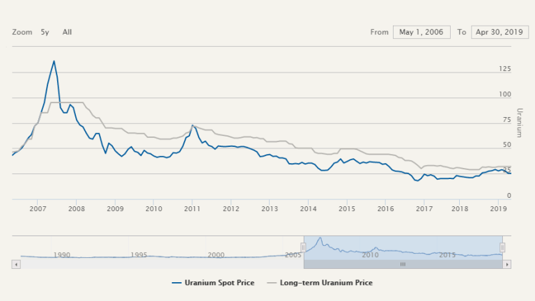 Мировые цены на уран в долл. США: 2006-2019 гг. Источник