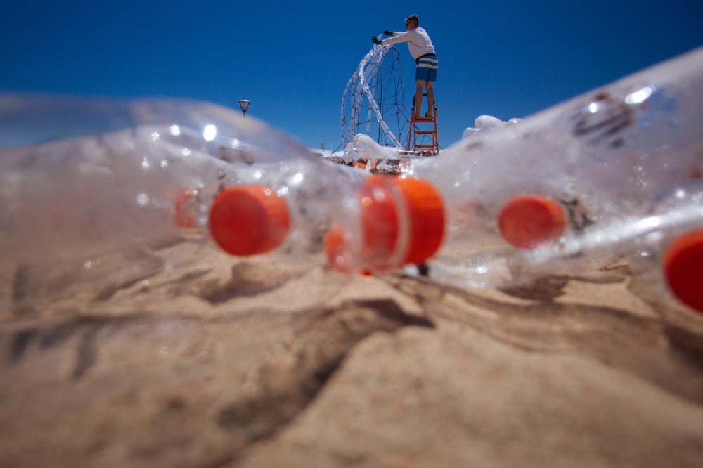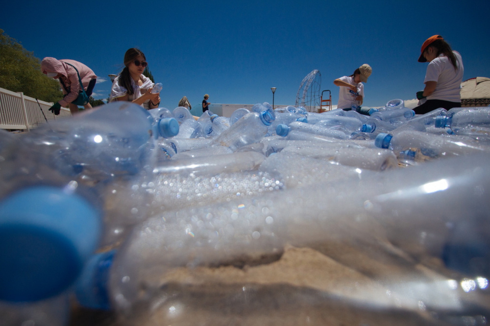 Художники из команды Trio art group в сотрудничестве с эковолонтерами создали на берегу Иссык-Куля арт-объект из собранных спортсменами пластиковых бутылок для привлечения внимания к экологической проблеме и культуре переработки пластика.