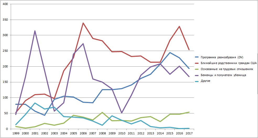 Тренды миграции, представленные на Рисунке 1, показывают, что переезды по «грин карте», связанные с занятостью довольно редки: менее 50 человек в год иммигрируют в США по этой категории. Супруги, дети и, в меньшей степени, родители американских граждан представляют большинство людей, иммигрирующих из Кыргызстана в Соединенные Штаты, за которыми далее в рейтинге идут победители «DV-визовой лотереи» и беженцы / лица, ищущие убежища.